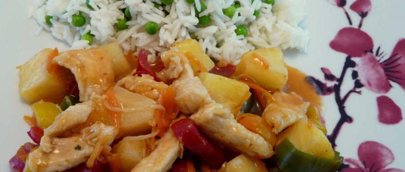 Hähnchen asiatisch süßsauer-scharf im Wok gekocht mit Reis.